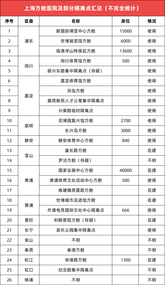 8日,上海日增本土病例(確診+無癥狀)已破兩萬。在抗疫最緊要關頭,登上老百姓關注排行榜榜首的,非以下兩個問題莫屬。一個是確診和密接是否能及時轉(zhuǎn)運;一個則是居家隔離抗疫是否能有民生保障。毋庸置疑,在上海抗疫方針不斷調(diào)整變化的形式下,政府如何解決病床缺口讓普通老板姓也擔憂不已。社交平臺上我們經(jīng)常能看見的、曝光較為頻繁的以世博方艙、新博覽會展方艙為代表的浦東方艙陣營,因最早加入抗疫前線,公眾較為熟悉。那么放眼整個上海,還有哪些方艙隔離點呢?CEIDI西遞根據(jù)網(wǎng)絡上不完全統(tǒng)計,將上海區(qū)域隔離點匯總?cè)缦拢?